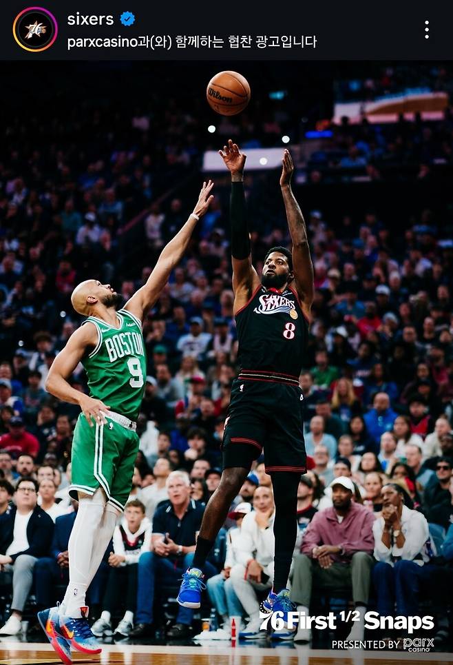 필라델피아가 두 자리 점수 차(27-37)로 흔들릴 때, 조지가 힘을 냈다. 백 다운과 몸싸움, 순간적인 스핀 무브 등으로 수비수를 따돌렸다. 그리고 오른손 덩크. 보스턴의 상승세를 가라앉혔다.