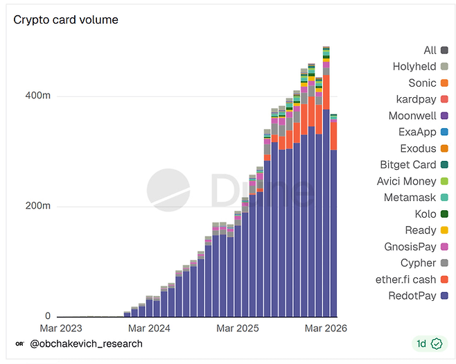 크립토기반 카드가 지난해 하반기부터 크게 유행을 타면서 올해들어서만 누적 결제금액이 17억달러를 넘어선 것으로 나타났다.
