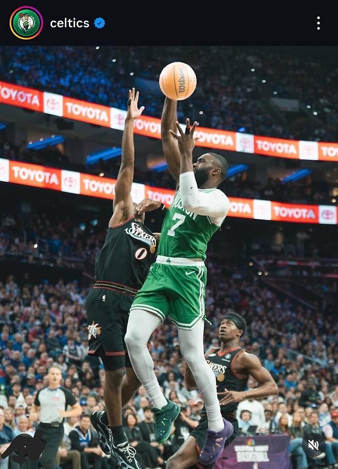 테이텀이 코너나 볼 없는 곳으로 향할 때, 브라운이 필라델피아 수비수를 공략했다. 수비수와 몸을 부딪힌 이후, 스텝 백 점퍼. 슛 감각을 유지했다.