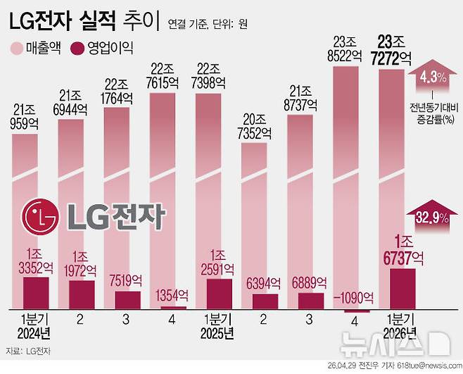 [서울=뉴시스] 29일 LG전자에 따르면 올해 1분기 연결기준 매출액은 23조7272억원, 영업이익은 1조6737억원으로 집계됐다. 매출액은 역대 1분기 기준 최대치를 기록했으며, 영업이익도 전년 동기 대비 32.9% 증가해 외형 성장과 수익성 개선을 동시에 이뤘다. (그래픽=전진우 기자)
