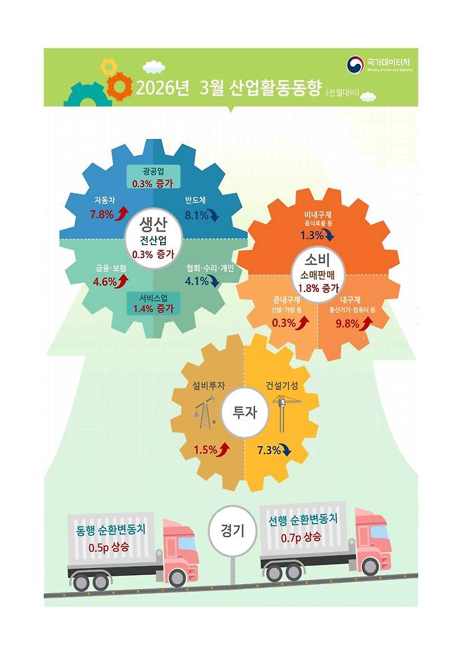 국가데이터처가 30일 발표한 '2026년 3월 산업활동동향'에 따르면, 지난달 전(全)산업 생산(계절조정·농림어업 제외)지수는 118.3(2020=100)으로 전월 대비 0.3% 증가했다.
