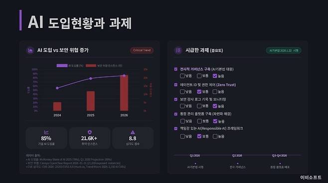 성 대표는 최근 기업들의 AI 도입이 빠르게 확산하고 있지만, 그만큼 보안 위협과 거버넌스 과제도 함께 커지고 있다고 짚었다. 기업 AI 도입률 상승과 함께 취약 인스턴스 노출, AI 관련 보안 취약점 증가가 동시에 나타나고 있으며, 국내에서는 2026년 1월 시행된 AI기본법에 대응할 전사적 거버넌스 체계가 더 이상 미룰 수 없는 과제가 됐다는 것이다. 발표에서는 전사 거버넌스 구축, 에이전트 ID 및 권한 제어, 감사 로그 기록과 모니터링, 파편화된 AI 자산을 묶는 통합 관리 플랫폼 구축, 책임감 있는 AI 프레임워크 정립 등이 우선 과제로 제시됐다.