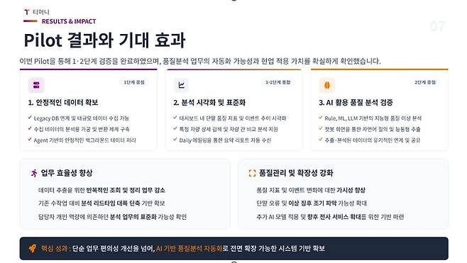 티머니는 2025년 9월부터 2026년 1월까지 약 5개월간 파일럿을 수행하며 데이터 파이프라인, 웹 시각화, AI 학습·추론 엔진, LLM 에이전트 서비스를 묶은 통합 아키텍처를 구현했다고 밝혔다. 그 결과 자동 데이터 수집, 분석 시각화 및 표준화, 자연어 질의와 AI 분석 검증, 데이터 추출·다운로드·메일링 자동화 기반을 확보했고, 기존 수작업 대비 분석 리드타임을 크게 줄일 수 있는 기반을 마련했다고 평가했다. 티머니는 이를 출발점으로 향후 초거대 AI 모델과 GPU 인프라를 접목하고, 자산 고장·수리 데이터 및 CSR 데이터와의 연계, 챗봇 업무 지원 확대, 현장 기사와 고객센터 접점 서비스 고도화까지 검토하고 있다고 설명했다.