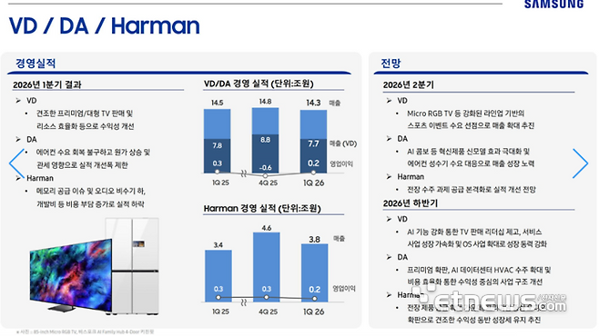 다만, DA사업부의 전반적인 수익성은 여전히 부진하다. 이날 삼성전자는 가전 사업에 대해 “경쟁 심화, 관세 및 지정학 리스크에 따른 변화로 수익성 부담이 가중되고 있다”며 “사업 전반의 선택과 집중을 추진하고 경쟁력을 보유한 핵심 사업에 집중해 지속가능한 성장 기반을 구축하겠다”고 밝혔다.