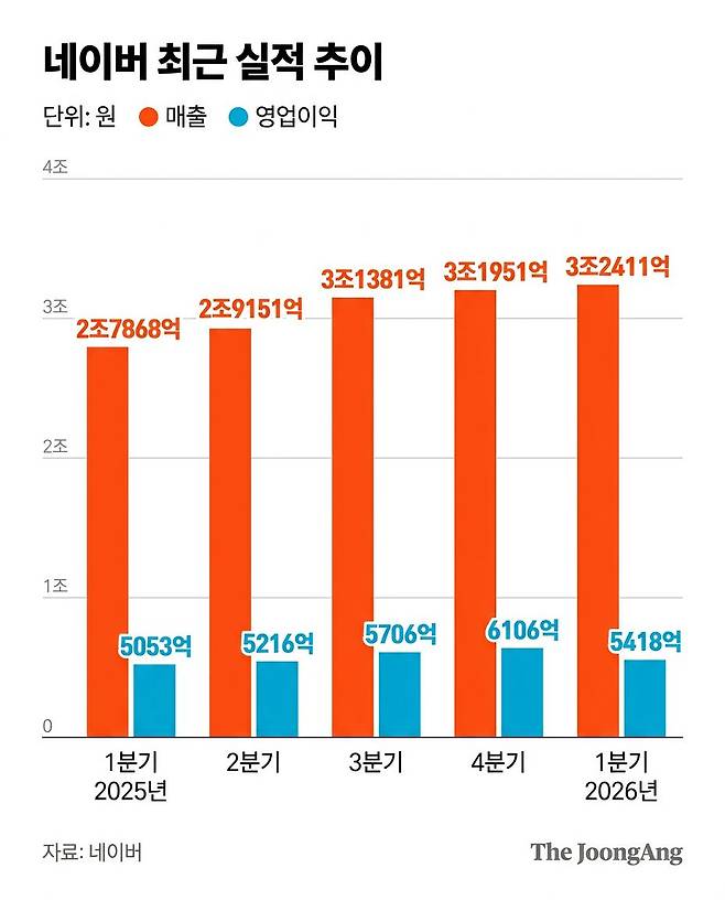 막대한 AI 투자 비용을 회수하려면 수익화 속도를 높여야 하는 상황이다. 네이버의 올 1분기 영업 비용은 2조 6993억원으로 1년 전보다 18.3%, 직전 분기보다 4.4% 상승했다. 영업 이익률(16.7%)은 전년 동기 대비 1.4%포인트 낮아졌다. 네이버는 “AI 경쟁력 확보를 위한 인프라 투자 등의 영향”이라고 설명했다.