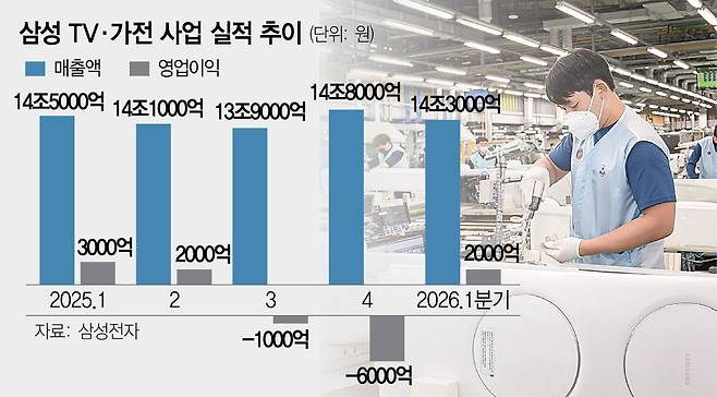 영업이익 2000억 원에 그친 영상디스플레이(VD)·생활가전(DA)사업부도 중동 전쟁으로 인해 물류비와 원자재값이 오르며 2년 연속 수천억 원의 적자가 예상된다. 이 사업부는 지난해 하반기 10년 만에 경영진단까지 받았지만 수익 구조를 개선하지 못했다.