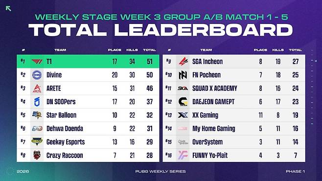 '이틀 연속 원탑 등극'…T1, 51점으로 그룹 A·B조 경기 1위 (PWS: 페이즈 1) [종합]