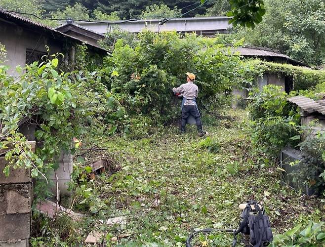 사진 보시면 아시겠지만, 오래 방치된 집 통로에 온갖 쓰레기, 전선, 철근 구조물과 함께 나무와 풀이 잔뜩 자라서 진입 자체가 안 되는 상황이었어요.