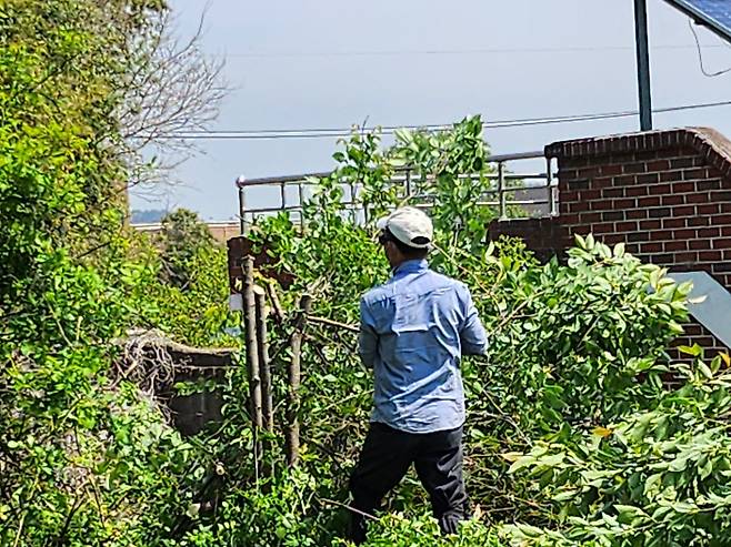 사진 보시면 아시겠지만, 오래 방치된 집 통로에 온갖 쓰레기, 전선, 철근 구조물과 함께 나무와 풀이 잔뜩 자라서 진입 자체가 안 되는 상황이었어요.