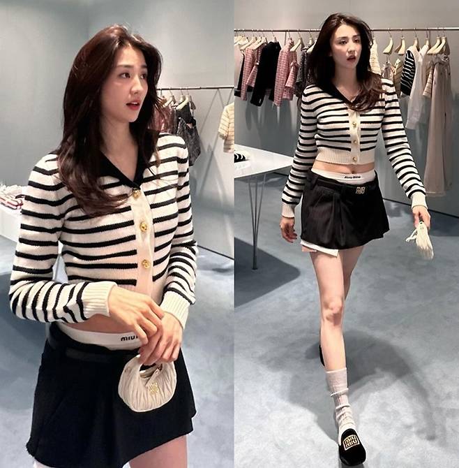 공개한 사진에서 박하선은 배꼽과 속옷이 살짝 드러난 로우라이즈 초미니 스커트에 스트라이프 케이프 크롭 니트 카디건을 착용한 프레피룩으로 7살 딸을 둔 엄마라고는 믿기지 않는 인형 미모를 과시했다.