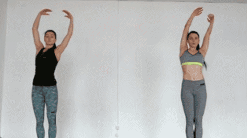 매트 위에 서서 두 발을 어깨너비로 벌리고, 손을 머리 위로 올려 손바닥이 서로 마주 보게 합니다. 상체를 왼쪽으로 회전시키며 손이 원을 그리듯 부드럽게 움직입니다. 이어서 상체를 오른쪽으로 돌리며 같은 동작을 반복하고, 좌우 방향으로 번갈아 수행합니다.