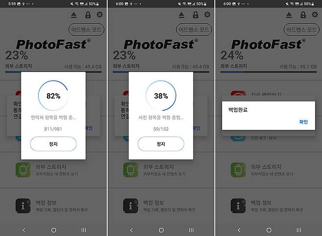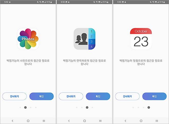 앱을 설치하고 기본적인 설정 과정을 거치면 알로코리아 포토패스트 포토큐브 S 연결 시 앱이 자동으로 실행된다. 앱을 처음 실행할 때 사진과 연락처, 일정 등의 접근 권한을 요구하는데, 해당 항목을 백업할 때 꼭 필요한 권한이니 허가해주어야 정상적으로 사용할 수 있다.