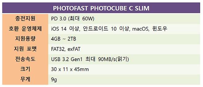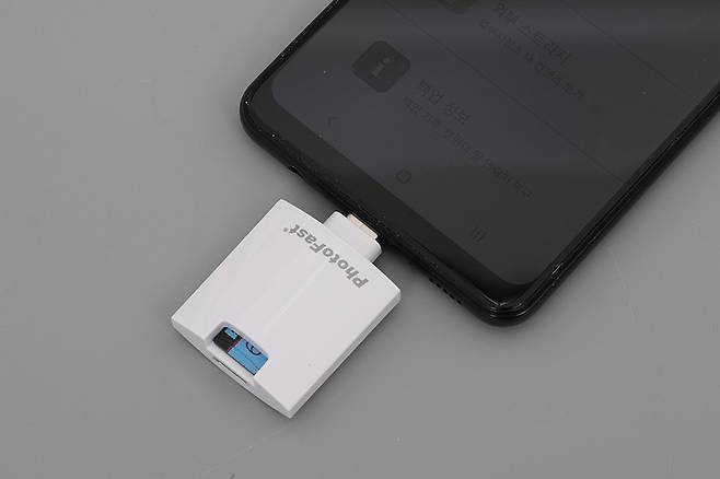 알로코리아 포토패스트 포토큐브 S를 스마트폰에 직접 연결하지 않고 USB C타입 충전 어댑터에 장착 후 C to C 케이블로 알로코리아 포토패스트 포토큐브 S와 스마트폰을 연결하면 스마트폰 충전과 동시에 백업이 진행된다. 백업할 데이터가 많은 경우 취침 전 이런 방식으로 연결해두면 잠자는 동안 백업과 충전이 모두 완료되기 때문에 편리하다. 충전 기능은 USB PD 60W까지 지원되기 때문에 USB PD 충전기와 연결하면 스마트폰의 고속 충전도 가능하다.