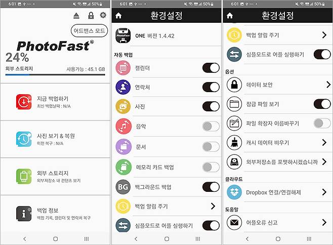 앱의 환경 설정에 들어가보면 캘린더와 연락처, 사진 외에도 음악이나 문서의 백업도 설정할 수 있으며, 스마트폰에 마이크로SD 등 저장 공간 확장을 위한 메모리카드를 추가한 경우에는 메모리카드도 백업 항목으로 넣을 수 있다. 또한 옵션에서 데이터 보안 항목도 보이는데, 4자리 암호로 앱 잠금 기능을 제공하고 있다.