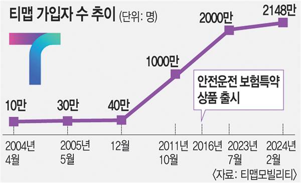 티맵은 2016년부터 운전점수와 보험료를 연계한 서비스를 시작했다. 내비게이션 앱 시장을 선점한 데다 보험 특약까지 생기면서 티맵 가입자는 급속도로 늘었다. 지난 14일 기준 티맵 누적 가입자는 2148만2913명으로 집계됐다. 보험사 입장에서도 UBI 특약은 사고 방지 효과를 볼 수 있어 티맵과의 협약 체결에 긍정적이었다.