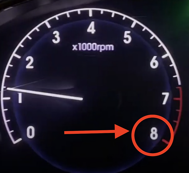 휘발유 자동차: 보통 숫자 '8' 또는 '9'까지(8,000~9,000 RPM) 표시되어 있고, 6,500 RPM 이상부터 '레드존'이 시작됩니다.