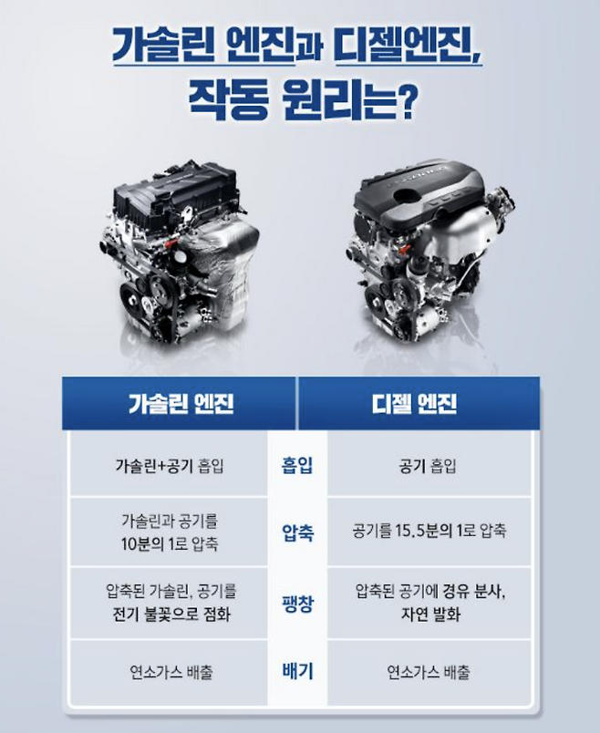 이유는 아주 간단합니다. 두 엔진이 연료를 태워 힘을 내는 '폭발 방식'이, 근본적으로 다르기 때문입니다.