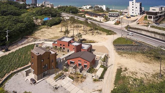젊은 부부의 꿈을 담은 소중한 공간들!그중 집은 맨 아래 목재로 지어진 건물뭔가 로봇이 손을 쭉 뻗고