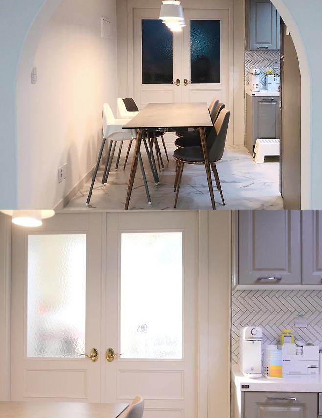 가족이 다 같이 보내게 되는 식사시간은 꽤 많은 시간을 차지하는데, 주로 분리수거나 빨랫감을 놓게 될 주방 베란다가 훤히 보이는 게 싫어 마블 유리로 시공한 중문을 설치했어요.