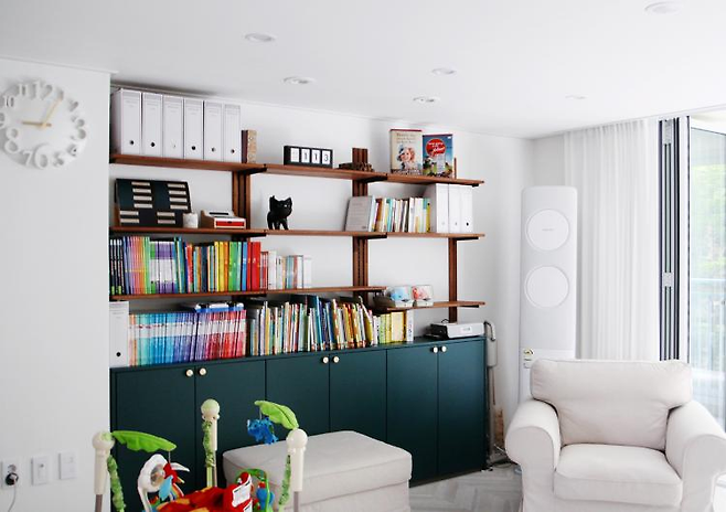 거실은 아이들과 많은 시간을 보내는 곳이라 TV를 설치하지 않았어요. 아이들 스스로 책장에서 책도 꺼내어 읽고, 엄마 아빠랑 뒹굴뒹굴 노는 공간이랍니다.