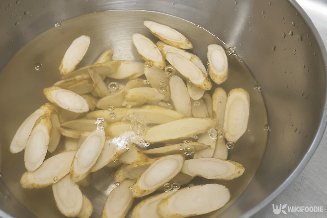 2. 찬물에 식초 2큰술을 넣고 썬 우엉을 10분 담가둔다.
