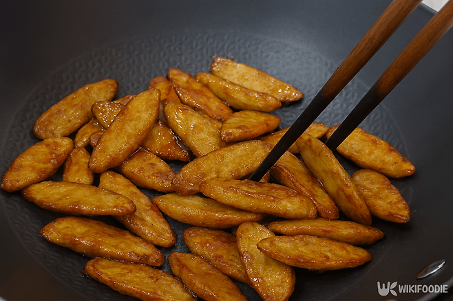 7. 튀긴 우엉을 넣고 빠르게 볶아 소스가 골고루 배도록 한다.