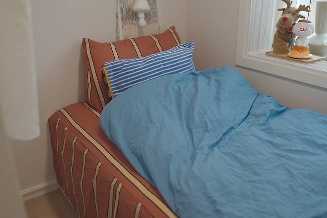 여긴 안쪽의 침실입니다. 슈퍼 싱글 침대와 캣타워 하나로 꽉 차는 아늑한 공간이에요. 침실엔 돌출된 창이 있어서 고양이들이 창가에 앉아 광합성을 합니다. 저도 그럴 때는 쿠션에 기대어 햇볕을 받으며 멍을 때리곤 해요.
