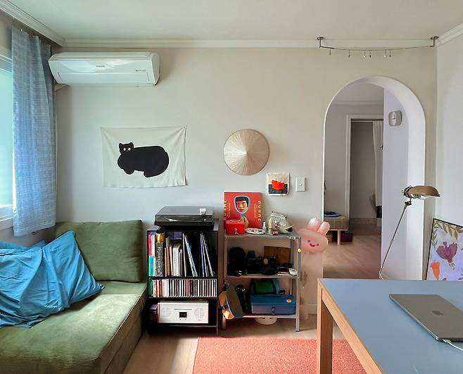 저희는 이 쓰리룸 집을 처음부터 원룸이라고 생각했어요. 16평 집을 방이 3개가 아닌 1개라고 여기면 굉장히 넓잖아요? 그래서 처음부터 화장실과 방에 딸린 미니 창고를 제외하고는 문을 달지 않았어요. 혼자 살면서 문을 다 떼고 지내보기도 했고, 부부와 고양이들만 있으니 괜찮을 거라고 생각했죠. 결과적으로 프라이버시 문제는 전혀 없고 동선 간 문을 여닫는 행위도 없어지니 너무 편해요.