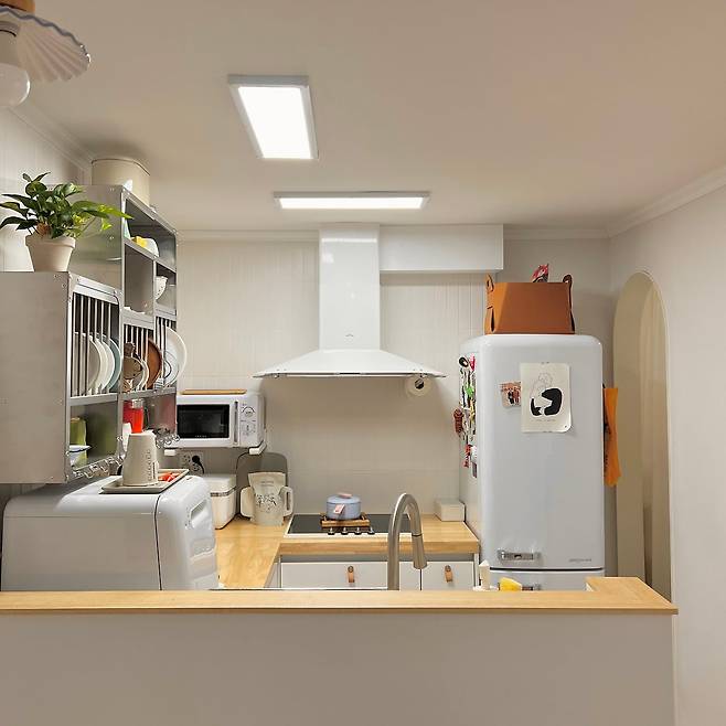 효율적인 동선을 위해 ㄷ자 주방을 만들며 벽 쪽에 있던 싱크볼은 가운데로 옮겨주었어요. 또 바깥에서 주방 살림이 너무 잘 보이지 않도록 낮은 가벽을 설치했습니다. 또 수납공간은 하부장만 'ㄷ' 자로 짜 넣었는데요. 상부장까지 하면 공간이 너무 답답할 것 같아 키친랙만 설치하고 자주 사용하는 그릇, 소형 냄비, 팬을 수납했습니다.