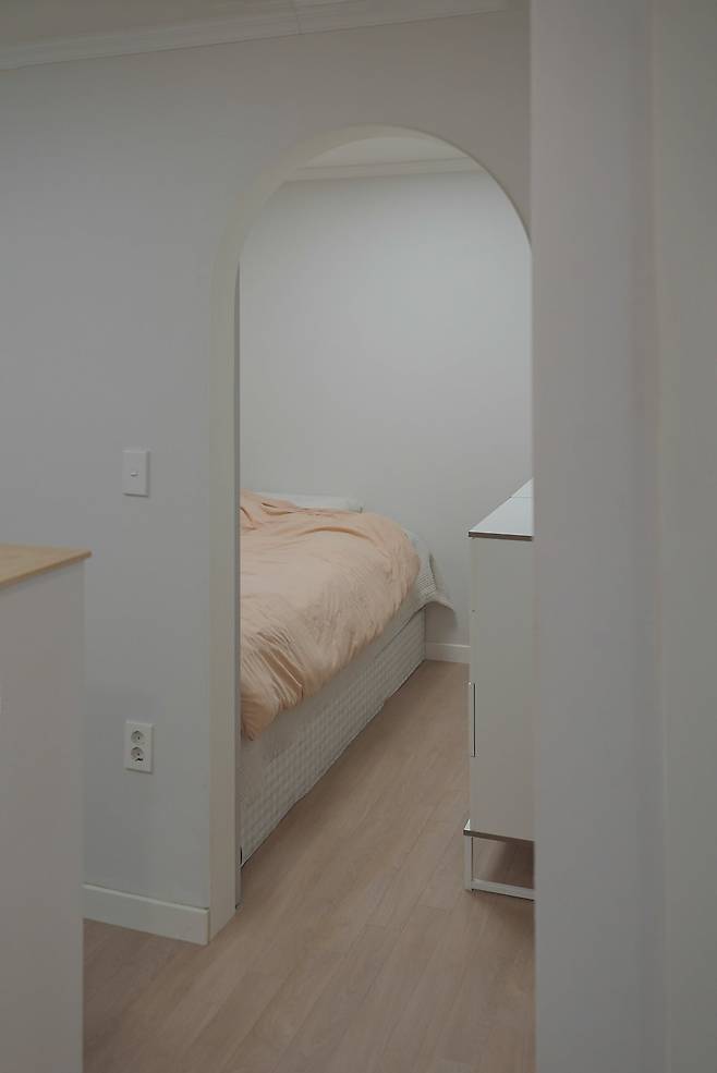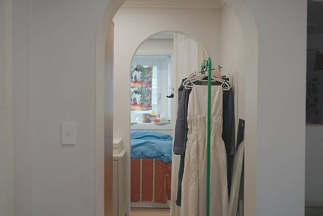 거실에서 바라본 제 방 입구입니다. 제 방은 가벽을 사이에 두고, 드레스룸과 침실이 붙어 있는 형태로 되어 있어요. 다시 말해 드레스룸을 지나 커튼을 걷으면 침실이 보이는 구조입니다.