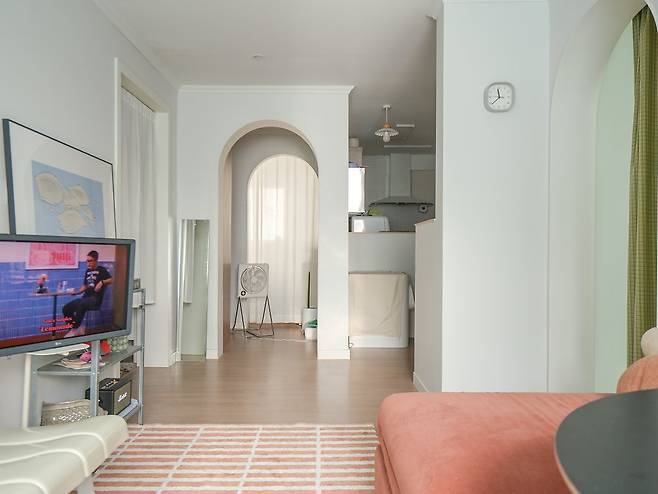 생활하다 보면 평수에 비해 큰 답답함을 못 느끼는데요. 그 이유는 모든 공간에 문이 없기 때문이기도 하지만, 상주하는 공간을 넓게 구성했기 때문이 큰 것 같아요. 당연히 좁은 세탁실이나 협소한 주방을 이용할 땐 좁다고 느끼기도 하지만 저희는 커피를 마시며 휴식하는 시간과 책상에서 작업하는 시간이 더 중요하기에 다른 공간의 협소함은 감수할 수 있는 것 같아요.