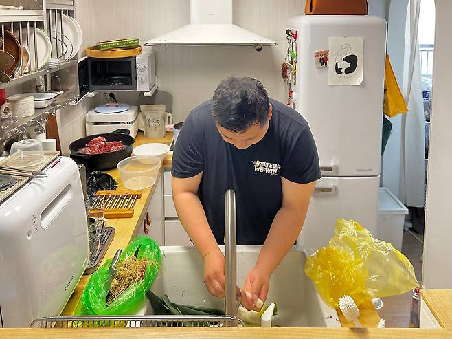 저희 집 주방에는 한 명만 들어갈 수 있어요. 대신 몸만 돌리면 싱크대, 조리대, 인덕션이 바로 손에 닿도록 동선을 최적화하였습니다. 현실적인 사진도 함께 남깁니다. 덩치가 좀 있는 남편이 주방에 들어간 모습이에요. 넓이가 체감되실까요?