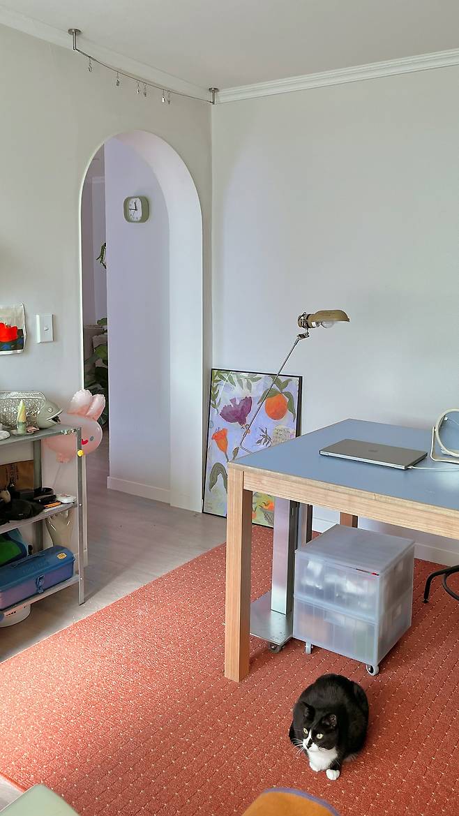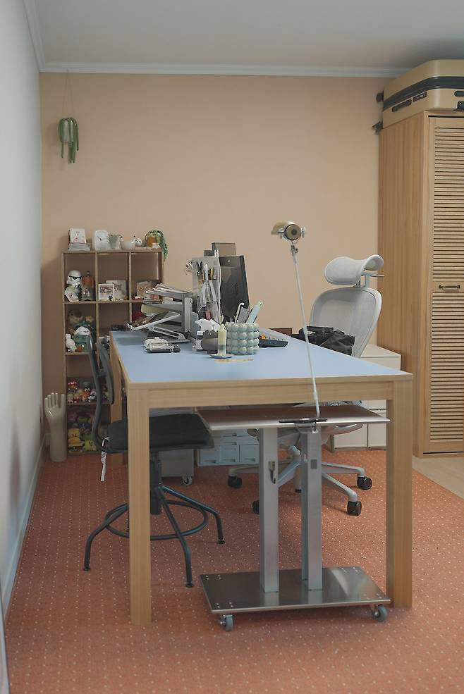 다음으로 소개해 드릴 곳은 확장된 거실처럼 사용하고 있는 작업방입니다. 저희 부부의 생활 반경은 단순해요. 거실에서 함께 커피를 마시거나 TV를 보곤 하니까요. 또 보통 때에는 한 명이 거실에서 무언갈 하고 있다면 한 명은 작업방의 소파에서 쉬거나 컴퓨터 작업을 합니다. 공간이 뚫려있기 때문에 서로 뭘 하는지 잘 알고 따로 있지만 함께 있는 듯한 느낌을 받아요.