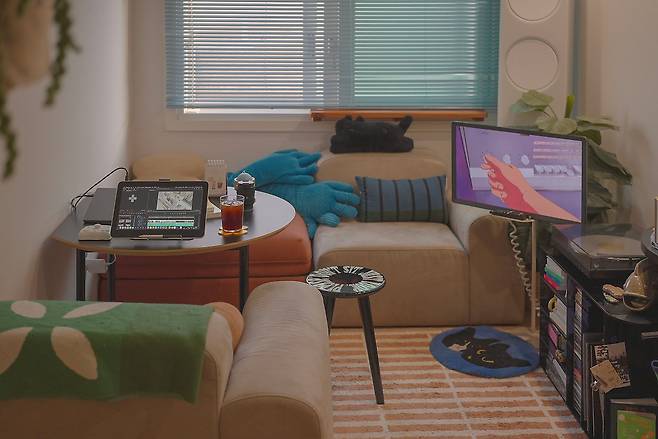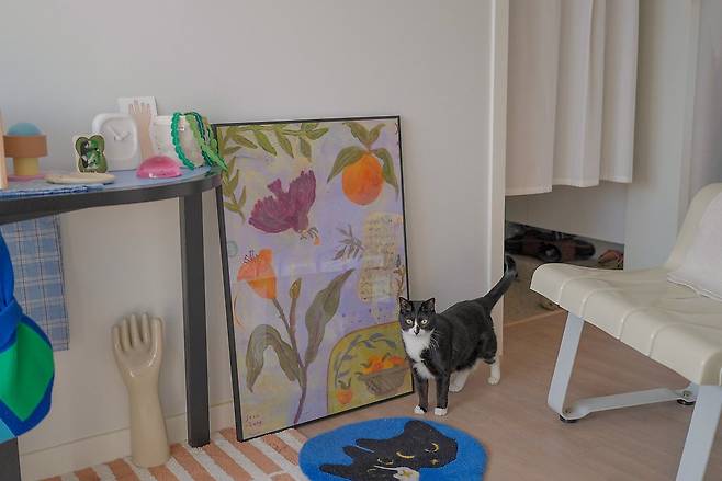 거실 곳곳에는 함께 사는 검정고양이를 닮은 아기자기한 소품이 놓여 있어요. 고양이가 그 옆을 지날 때마다 얼마나 잘 어울리는지 모릅니다.