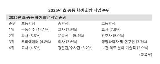 교육부와 한국직업능력연구원은 초·중·고 학생, 학부모, 교원 등 3만7408명을 대상으로 희망직업, 진로교육 환경, 인식 및 요구사항 등에 대해 조사한 '2025년 초·중등 진로교육 현황조사' 결과를 27일 발표했다.