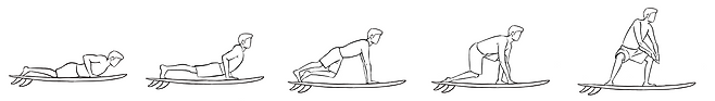 기다리던 파도가 왔을 때도, 마음이 조급하면 너무 작은 파도를 타려고 하거나, 준비가 안 된 상태로 파도를 타려고 하게 됩니다. 이런 경우엔 힘겹게 패들링을 하고서는 파도는 못 타고 체력만 낭비하게 되기 일쑤입니다. 파도를 발견했을 때는 내가 이 파도를 탈 수 있을지 자신에게 물어봐야 합니다. 지금 포지션에서 내 실력과 남은 체력으로 이 파도를 잡을 수 있을까? 판단이 서면, 지체없이 패들링을 시작해야 합니다. 망설일 시간은 없습니다. 온 힘을 다해 팔을 8번 정도 저어 속력을 내고, 파도가 발을 치는 것이 느껴지면 마지막 힘을 다해 두 번 정도 더 패들링을 합니다. 내 속력과 방향이 파도와 잘 맞았다면, 파도가 나를 밀어주는 힘이 느껴지기 시작할 겁니다. 내 속력이 점점 빨라지는 것이 느껴지고 이제 파도에 몸을 맡겨도 되겠다는 확신이 들면, 두 팔로 보드의 중간께 되는 부분을 밀어 상체를 일으켜 일어납니다. 이 동작을 팝업Pop-up 이라고 합니다.