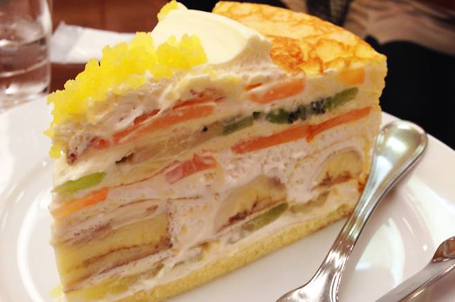 부드러운 크레이프와 신선한 과일이 어우러져 달콤한 조화를 이룹니다.