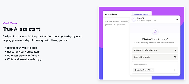 오늘 소개할 서비스 ‘Scene’는 이런 문제를 해결해 주는 곳으로, ‘아이디어가 웹사이트가 되는 곳, 아이디어부터 출시까지 전체 과정을 진행할 수 있는 곳입니다’라는 슬로건을 갖고 있어요. 템플릿 등을 바탕으로 빠르게 와이어프레임을 제작하는 것에 초점을 맞춘 것이 아니라, AI 비서 역할을 하는 ‘뮤즈’를 통해 브리프를 먼저 생성하고 확인하고 수정한 뒤 맞춤형으로 와이어프레임을 제작할 수 있어요.