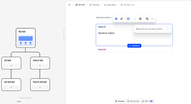 또 콘텐츠 기능을 지원하는데 와이어프레임에 포함된 각 블록에 대한 설명을 입력할 수 있어요. 와이어프레임만 있으면, 제작한 사람이 맥락이나 배경 등을 하나씩 설명해야 하는데 이렇게 블록 단위로 설명을 입력하게 되면 상세 내용을 함께 전달할 수 있어 간단한 화면의 경우에는 정책서를 대신하는 것도 가능해요. 코멘트를 남기는 기능도 있어서 의견을 주고받기도 좋은 환경이에요.