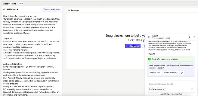 가입 후, 프로젝트를 생성하면 바로 편집 모드를 확인할 수 있는데요. 오른쪽 아래에는 ‘뮤즈 AI’가 자리 잡고 있는데, 브리프와 와이어프레임 생성을 기본으로 예제를 활용하거나 원하는 내용을 입력해 요청할 수 있어요. 위 이미지는 제가 빵집 소개를 위한 랜딩페이지 예제를 활용한 것으로 왼쪽에 와이어프레임 생성에 필요한 기본 정보가 생성된 것을 알 수 있어요. 프롬프트를 활용해 바로 특정 기능이나 화면에 대한 와이어프레임을 생성하는 것이 아니라 브리프를 먼저 확인할 수 있다는 점이 서비스의 가장 큰 특징이라고 할 수 있죠. 브리프에 포함되는 내용은 아래와 같아요.