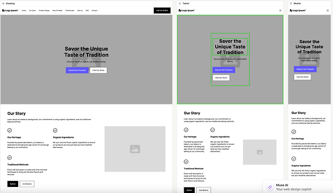와이어프레임 생성 후에도 AI 비서 뮤즈와 대화를 이어갈 수 있는데요. 예를 들어, ‘빵이 만들어지는 과정을 숏폼 영상으로 제작해 넣고 싶다’는 이야기를 했는데 섹션에 따라 어떤 식으로 영상을 활용하고 적용하면 좋을지에 대한 의견을 정성스레 남겨줬어요.
