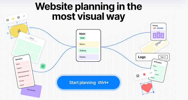 세 번째로 소개할 서비스는 사이트맵, 사용자 플로우, 와이어프레임을 세 가지 핵심 기능을 제공하는 곳이에요. 사이트맵을 바탕으로 와이어프레임 제작과 설명 등을 만들 수 있어요.