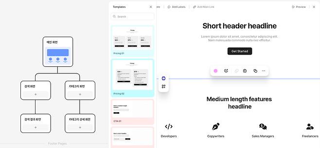 특정 화면을 선택하면, 기본 제공되는 템플릿을 통해 와이어프레임을 빠르게 만들 수 있으며, 간단한 버튼 모양이나 텍스트, 링크 적용, 정렬 등의 편집 기능도 활용할 수 있어요. 미리보기 기능도 지원하기에 특정 화면에 대한 와이어프레임을 공유하기도 좋고요.