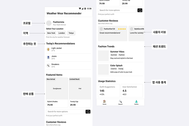 저는 '날씨에 따라 입을 옷을 추천해 주는 서비스의 홈 화면'을 만들어 달라고 요청했어요. 결과를 확인해 보니 생각하지 못했던 여러 내용을 포함해 주었더라고요. 저는 날씨와 추천 복장 몇 가지가 보이길 기대했는데, 패션 트렌드와 상품 카드까지 포함해 커머스 서비스에 가까운 와이어프레임을 그려줬어요.