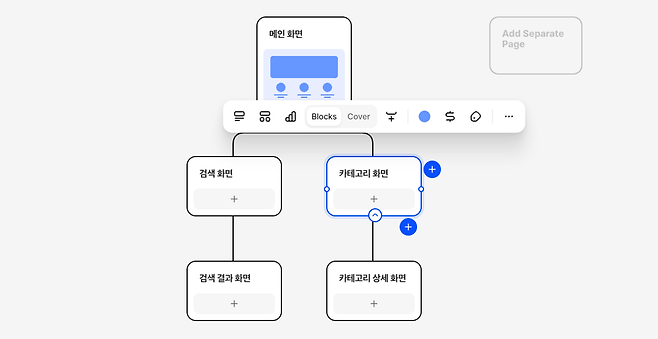 사이트맵의 경우 마인드맵을 만드는 것처럼 첫 화면을 기준으로 구조에 따라 화면 단위의 블록을 생성할 수 있어요. 각 화면에 대한 설명이나 라벨(업무 진행 상황 기준), 협업을 위한 코멘트 작성 기능 등을 활용할 수 있죠.