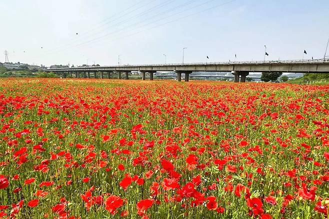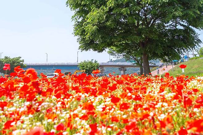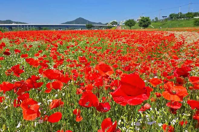 바람결에 살랑이는 붉은 꽃물결. 나주 영산강 둔치체육공원과 정원 들섬 일대 약 14만㎡는 지금, 꽃양귀비로 장관을 이루고 있다.