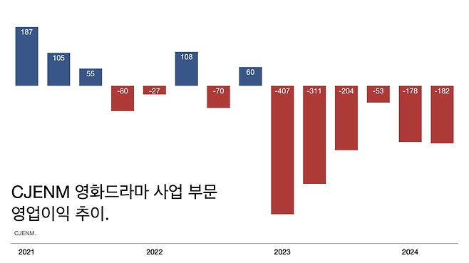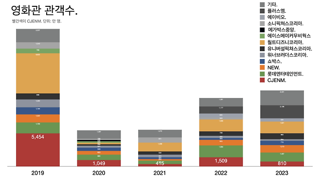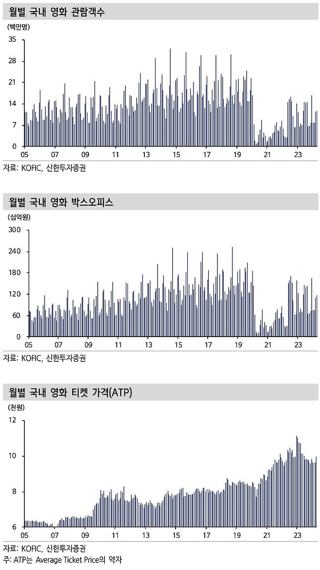 (코로나 팬데믹 이후 줄어든 관객이 아직 회복되지 않은 상태다. 영화 티켓 가격이 올라 CJCGV 등은 실적이 개선됐지만 영화 산업의 퇴조가 계속되고 있다. 신한투자증권 자료.)