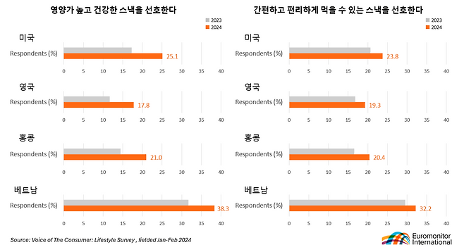 글로벌 데이터 분석 기업 유로모니터 인터내셔널은 스낵 시장 주요 트렌드 중 하나로 글로벌 소비자의 ‘식사의 스낵화’를 꼽았다. 유로모니터 ‘2024 보이스 오브 컨슈머: 라이프스타일 서베이’에 따르면, 주요 국가 기준 미국 성인 6명 중 1명(17%), 영국∙브라질 성인 8명 중 1명(13%), 싱가포르∙홍콩 성인 9명 중 1명(11%) 꼴로 식사를 스낵으로 대체한다고 응답했다. 해당 국가 모두 2023년 대비 2024년 응답률이 3% 이상 증가했다.