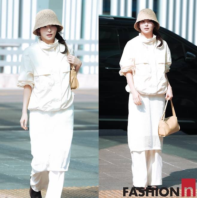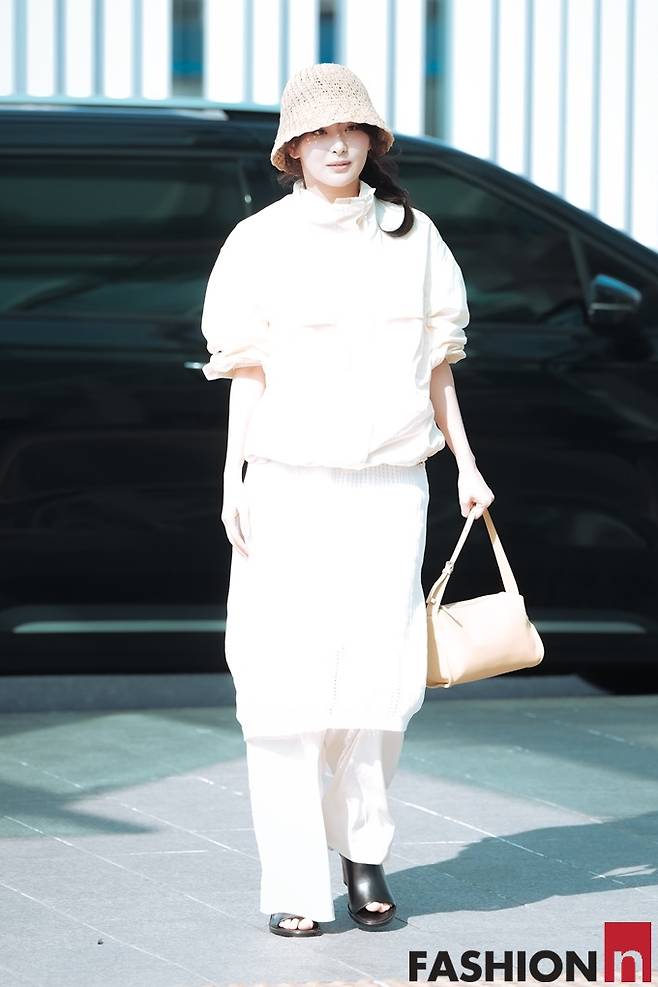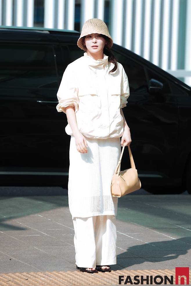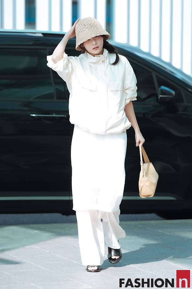 이날 슬기는 라탄 스타일의 버킷햇에 베이지 바람막이 재킷을 입고, 화이트 팬츠 위에 시스루 스커트를 매치한 출국룩으로 러블리하면서도 여성스러운 분위기를 자아냈다.