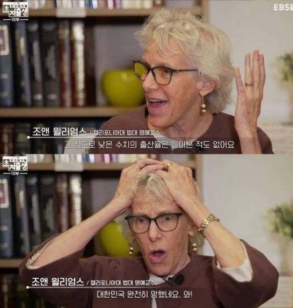 인구학 전문가인 미국의 조앤 윌리엄스 캘리포니아주립대 명예교수는 EBS ‘다큐멘터리 K-인구대기획초저출생’에서 “대한민국 완전히 망했네요” “와! 그 정도로 낮은 수치의 출산율은 들어본 적도 없어요.”라는 반응을 보였다.